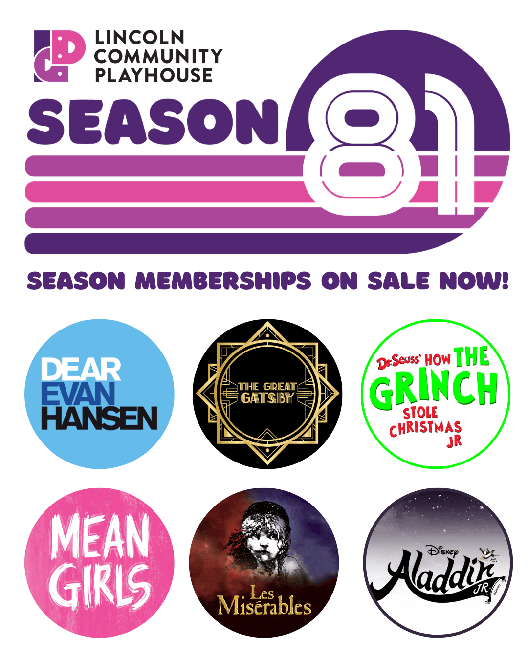 Tickets may be purchased online, by phone or in person at the Lincoln Community Playhouse Box Office.